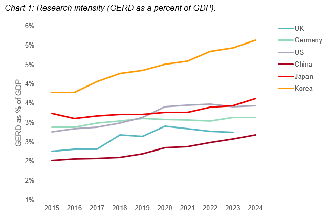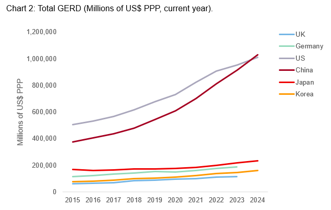 To assess the research landscape, this analysis utilizes Gross Domestic Expenditure on R&D (GERD) as an indicator of research intensity and volume. It is important to note that GERD is a composite metric reflecting the total expenditure across universities, government bodies, and the private sector. However, it remains a valid proxy for the entire research enterprise. To ensure cross-border comparability, financial data is converted using Purchasing Power Parity (PPP) which accounts for differences in the cost-of-living in specific economies.