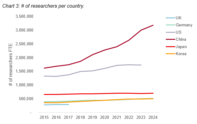 Research capacity is fundamentally driven by human capital (but automated research using AI and robotics may become significant in the future). The total number of researchers includes staff outside of academia; however, it provides an indication of a nation’s total R&D capacity. China’s research capacity is currently characterized by rapid expansion. This growth is reflective of both population scale and a strategic economic pivot from low-cost manufacturing toward R&D-intensive sectors, such as advanced electronics and automotive engineering.