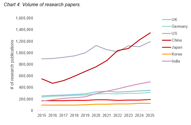 An analysis of research outputs (scholarly articles) and citation impact reveals a shift in Asian research. Between 2016 and 2025, China’s annual research output more than doubled, and now surpasses that of the United States. India saw similar growth over the same period, but the total volume is less than half of China’s.