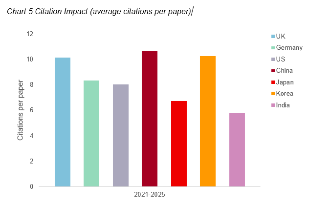 Other nations experienced a modest increase of approximately 30% but Japan’s growth was lower. Despite this rapid scaling of volume, China has successfully maintained its citations per paper relative to global peers, suggesting that quality has not been sacrificed for quantity. India and Japan are lagging other countries for citation impact, suggesting room for improvement.